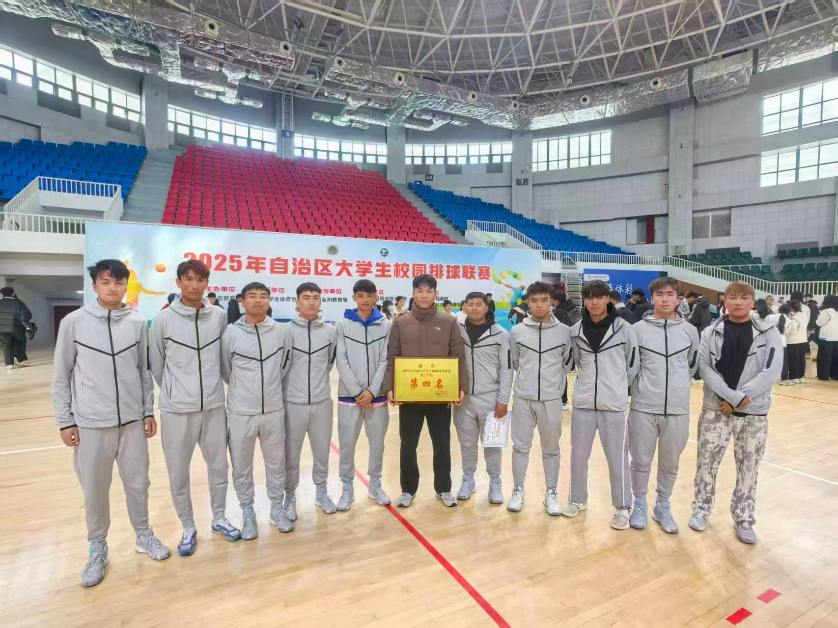 11月18日,2025年自治区大学生校园排球联赛在新疆应用职业技术学院落下帷幕。本届比赛来自19支学校29支代表队330名运动员参赛,我校男子甲组荣获第四名的优异成绩 ,同时新疆和田学校荣获体育道德风尚奖。